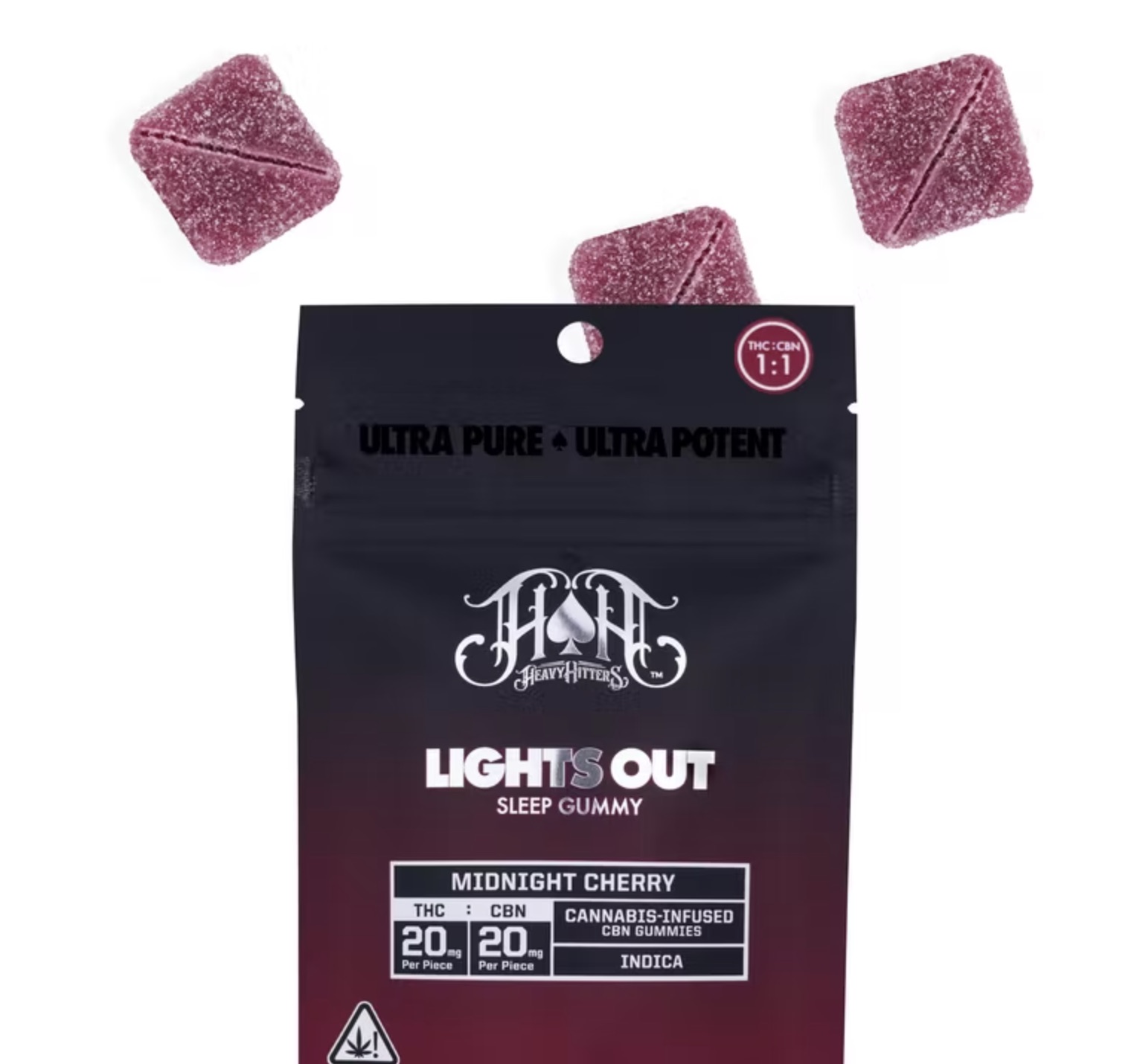 Using a powerful combination of THC and CBN delivered by the velvety flavor of black cherries Lights Out Midnight Cherry is the undisputed Heavyweight Champion of night-time confections pummeling you with right hooks of heavy relaxation and always winning with a stunning KO.20mg THC & 20mg CBN per serving/ 5 gummies totalStrain Type: IndicaFlavor: Sweet and velvety midnight cherryTerpene Blend: Myrcene Caryophyllene Humulene