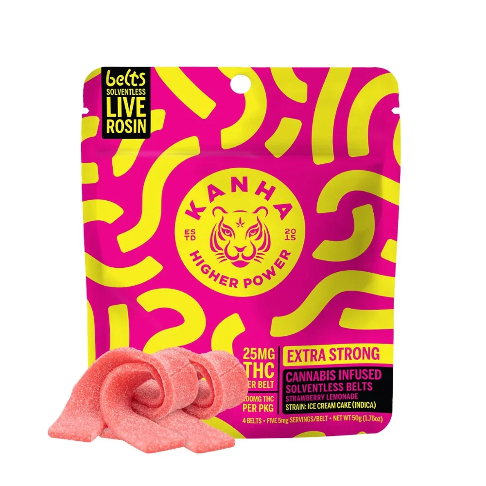25mg THC per belt/100mg THC per package Relax and unwind with our Strawberry Lemonade Belts a bold Indica blend for the kick back connoisseurs. Enhanced with solventless rosin for deep relaxation and euphoria. Strain is Ice Cream Cake.