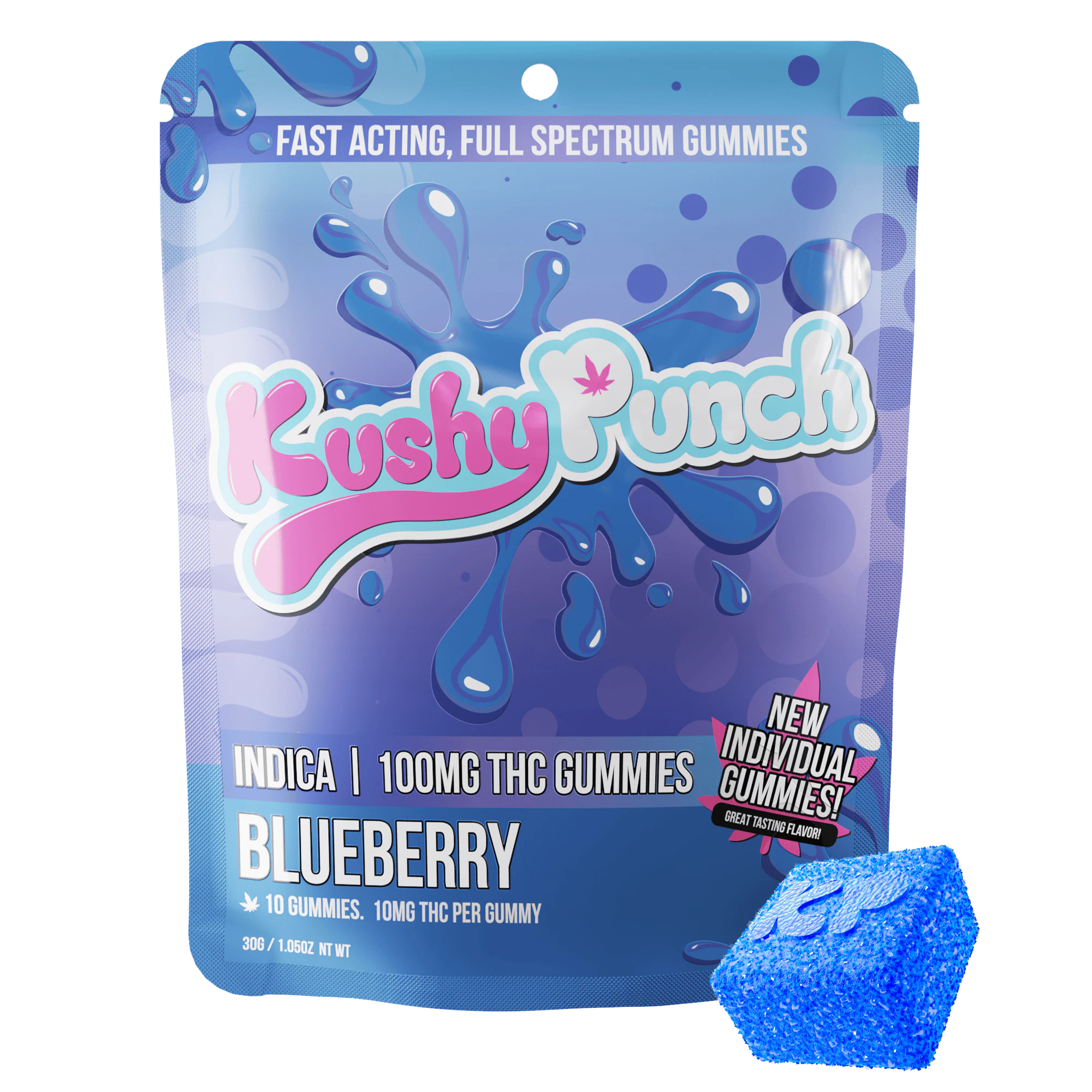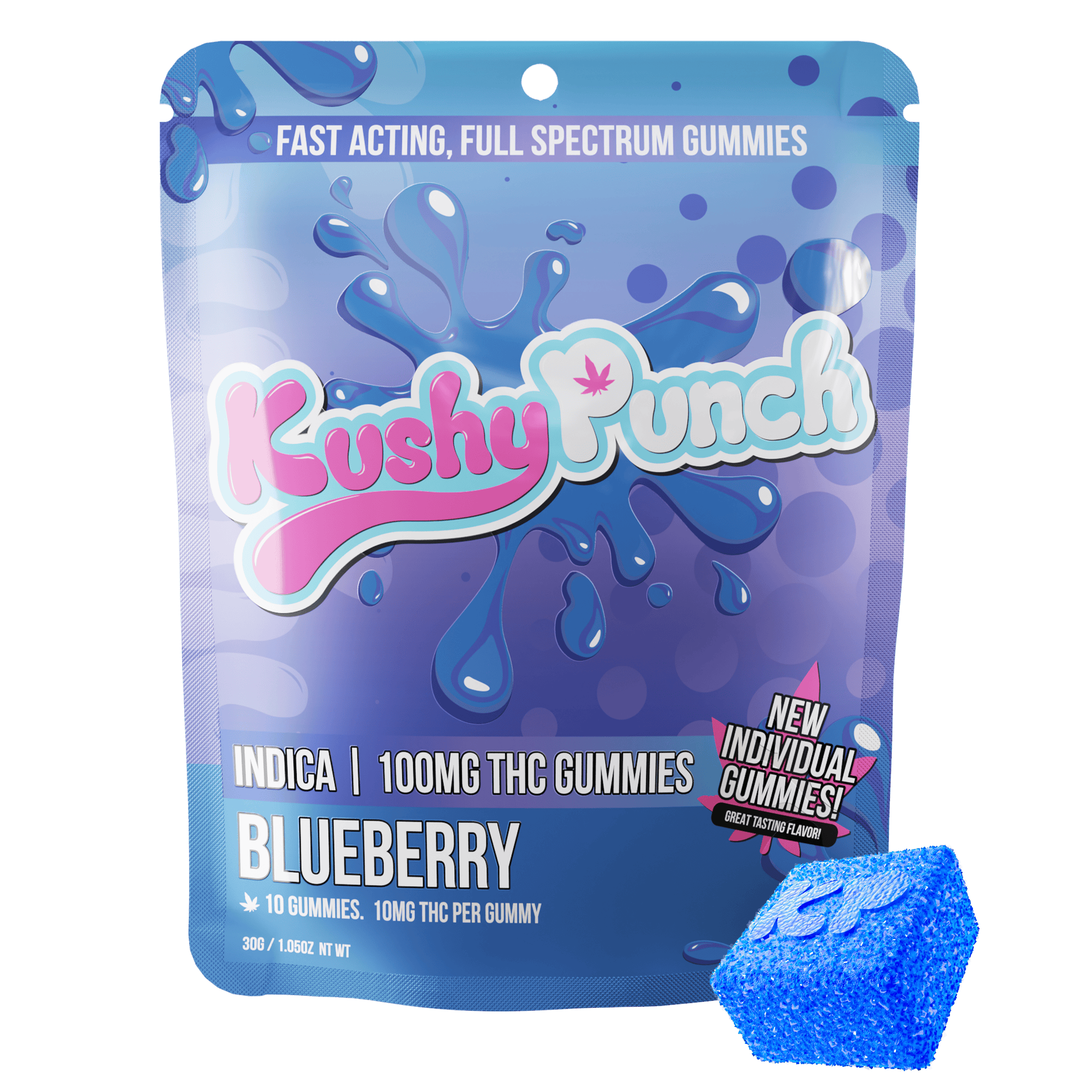 10 Individual Kushy Punch Gummies 100mg THC Indica Blueberry Flavor Contains Full Spectrum Oil 15 Minute Fast Activation..