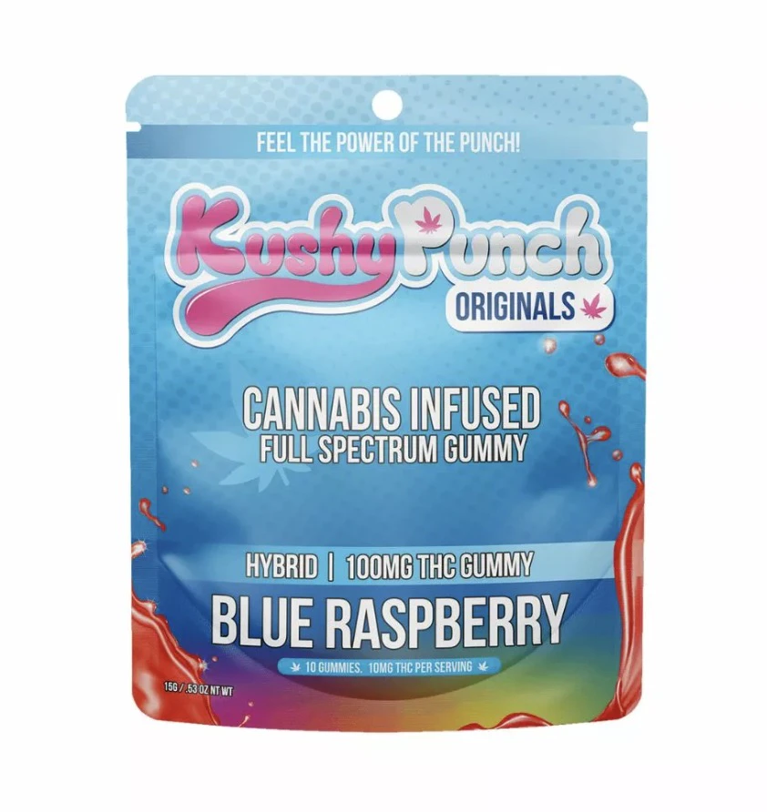 KushyPunchs 100mg Sugar Free hybrid gummys juicy Blue Raspberry flavor pairs perfectly with our famous full spectrum oil delivering a down-the-line head-body high that is like nothing else out there.Those that are new to KushyPunch love the Choose Your Own Adventure vibes that comes with the hybrid. Its also a hit with those that are sensitive to straight sativas and need a counterweight to that effervescent high.Raspberry flavor 100mg THC (10 x 10mg doses) Full spectrum oil w/ cannabinoids flavonoids + lipids Low calorie low sugar 100% organic colors & flavors Non GMO free from peanuts dairy gluten and fat
