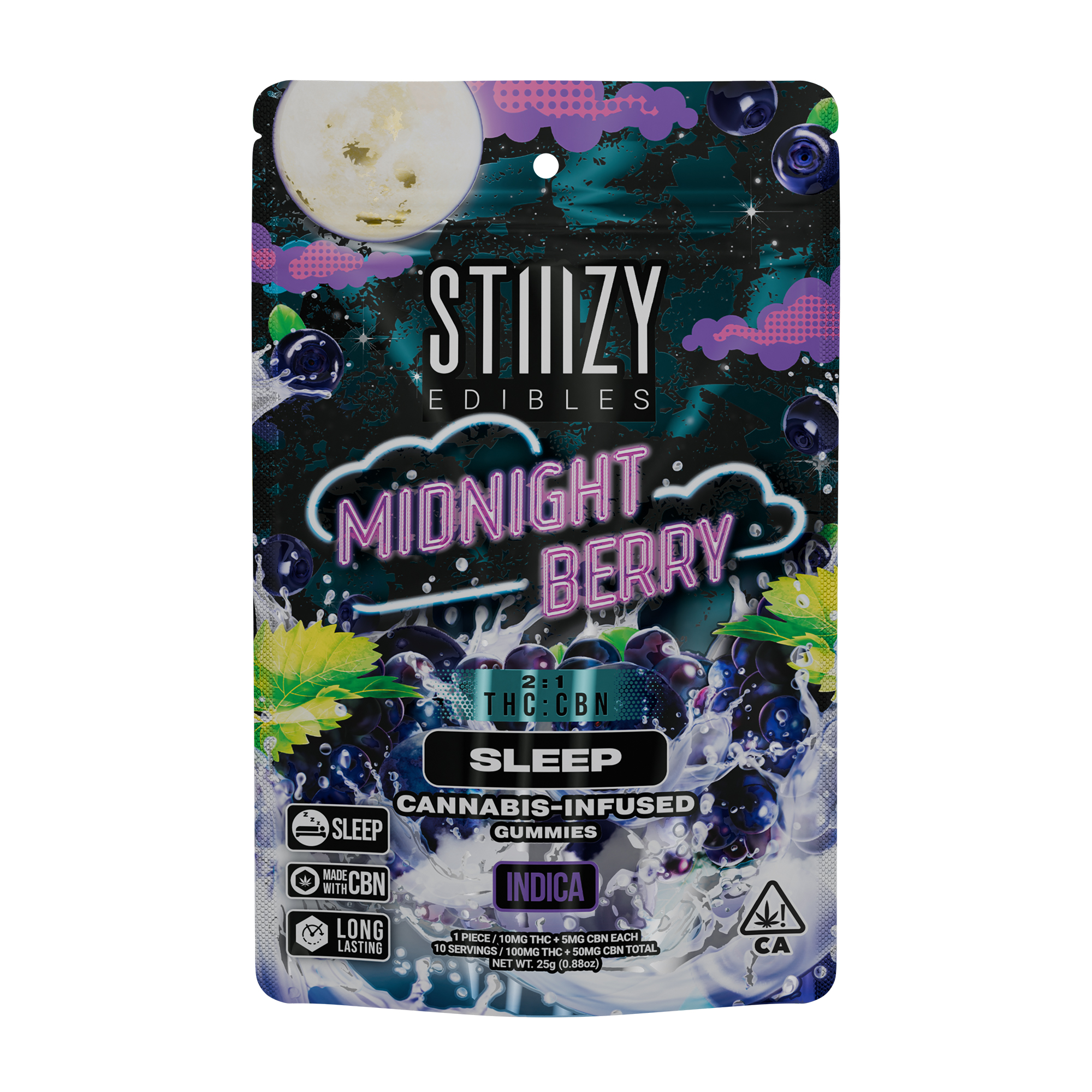 DESCRIPTION: Midnight Berry delivers the bold and juicy flavors of blackberries and blueberries blended perfectly for a savory experience. Now offering 2:1 THC to CBN gummies, Midnight Berry offers a calming and euphoric high for those looking to enhance their night time experience.