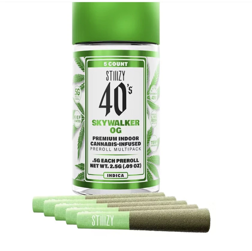 Taste: Earthy DieselDescription: With its profound diesel and gassy aroma Skywalker OG is known for its effects and flavorful aftertaste. With the extra kief coat on our 40s Skywalker OG is sure to keep you feeling like you are floating in space. Feeling: Relaxed Sleepy Happy.Elevate your pre-roll game. Stiiizy 40s pre-rolls are setting the standard with high potency cannabis infused joints coated evenly with kief. Using our proprietary live resin infusion methods we have designed every pre-roll to offer 40%+ THC potency with a unique flavor profile. With a smooth inhale and tasteful exhale each and every Stiiizy 40 is packed with indoor grown flower specifically made to ensure a potent and long-lasting high. Spark up the 40s.
